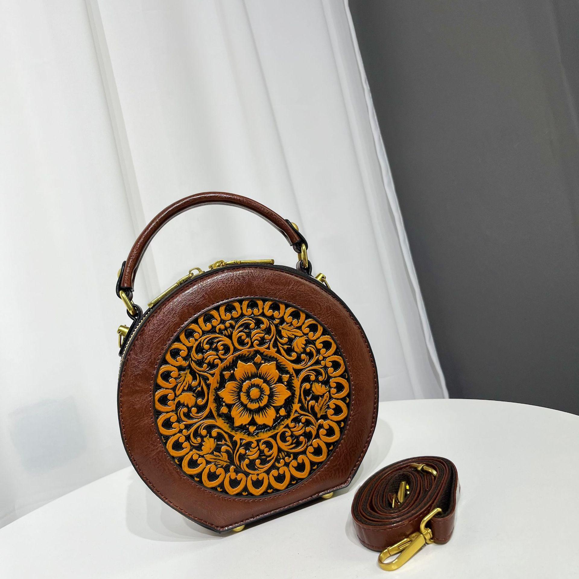 Этническая винтажная круглая сумка через плечо - женская сумка через плечо с резным цветком ручной работы, минималистичная текстура, сумка-тоут большой вместимости