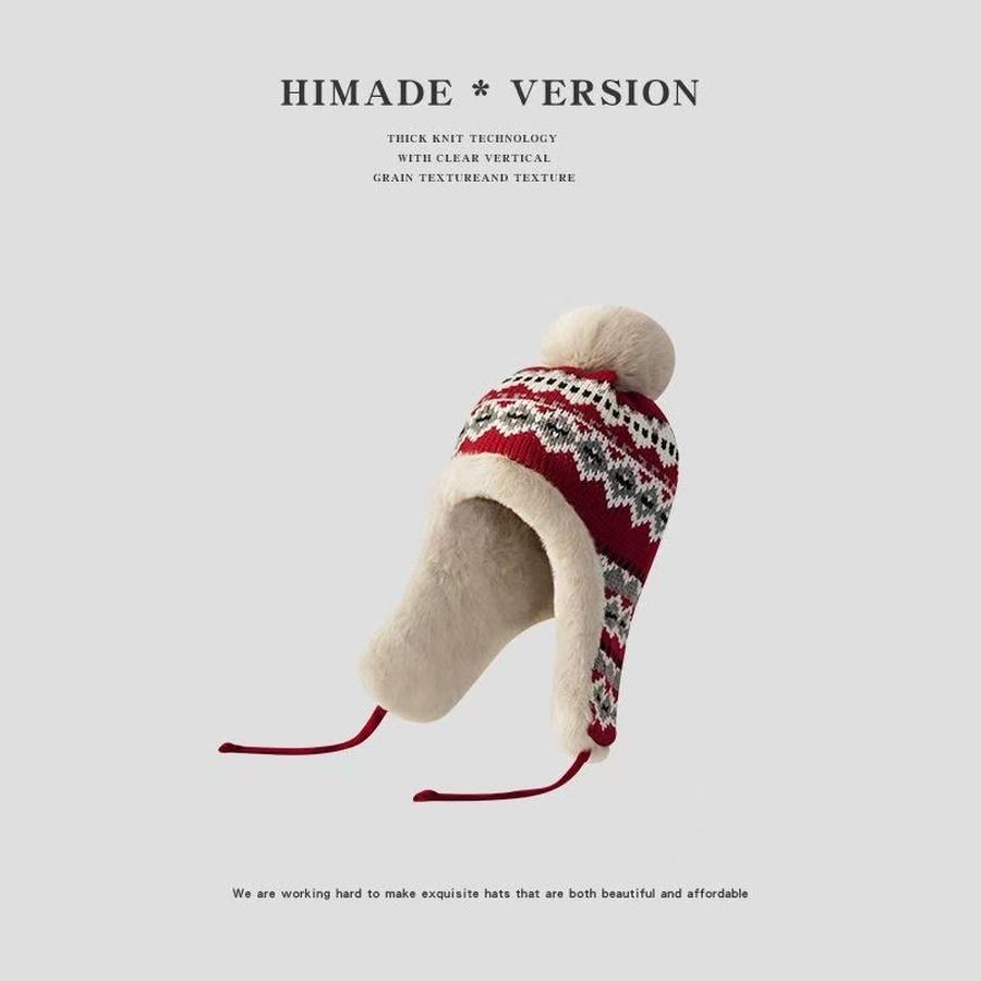 Этническая шапка для женщин, Зимняя вязаная теплая толстая флисовая шапка, Защита от холода, Толстый флис, Подчеркивающая овал лица, Шапка с защитой ушей, Железная шапка красный