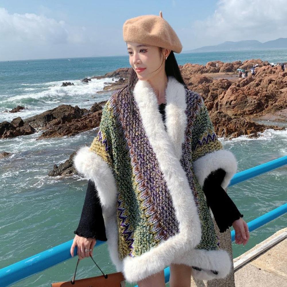 Этнический стиль большой меховой воротник шаль с женской дорожной одеждой осень и зима теплая вязаная куртка накидка шаль прилив One size