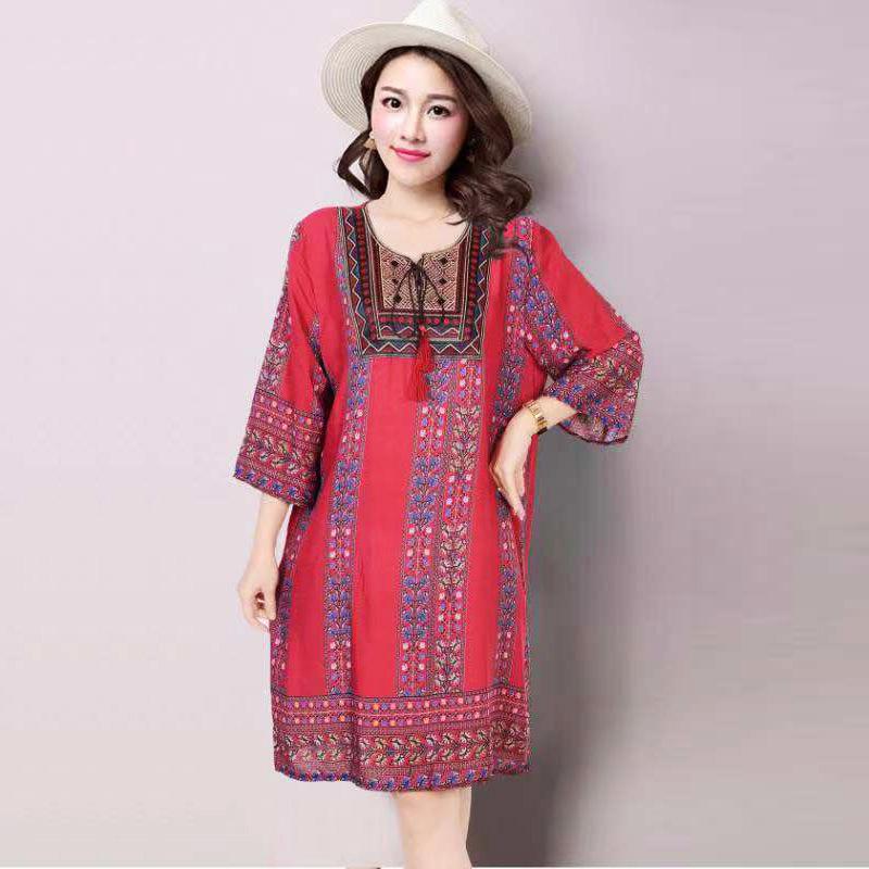 Этническое платье А-силуэта: Хлопок и вискоза Литературный ретро для весны/лета One Size