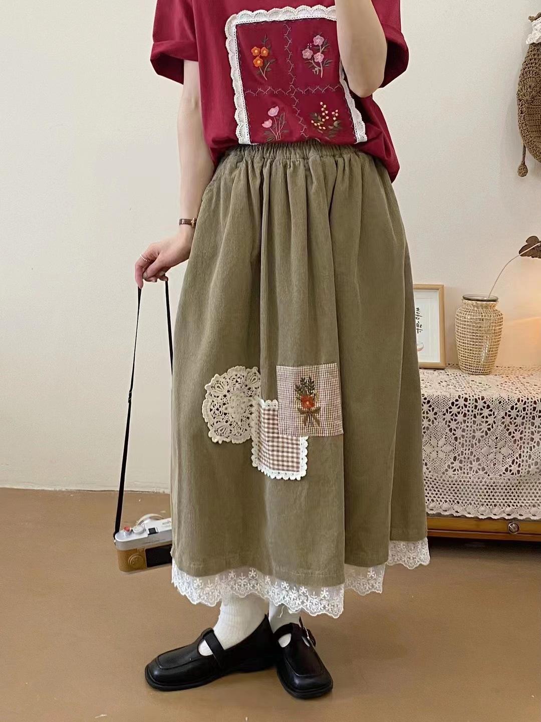Юбка из вельвета с вышитым японским лесом Johnature, осенняя ретро-универсальная женская юбка с эластичной талией One Size темные хаки