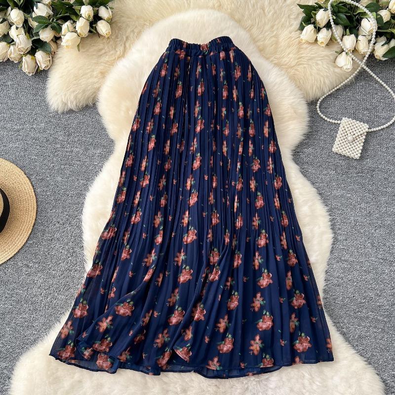 Юбка из шифона с цветочным узором, нежная и стройнящая, с хорошей драпировкой. Это юбка А-силуэта средней длины. One Size темно-синий