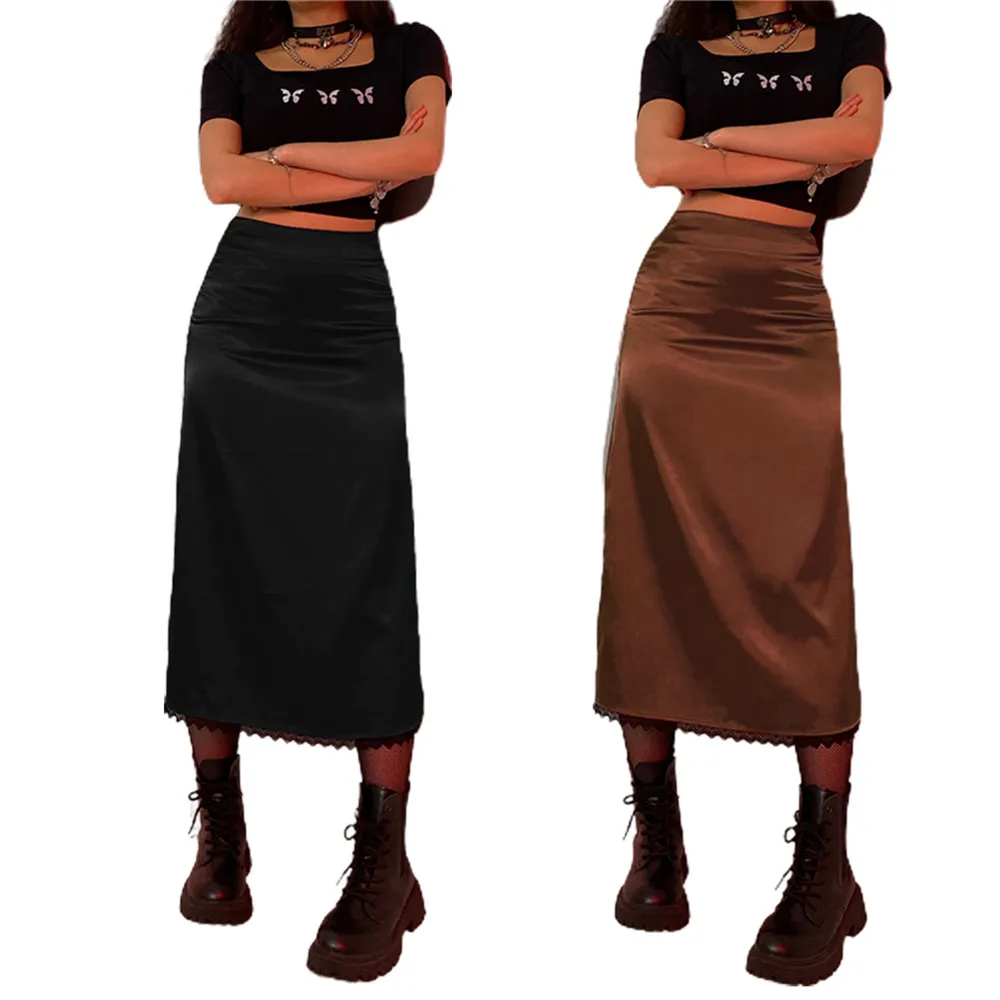 Юбка-макси Женская Длинная атласная, модная кружевная в стиле пэчворк, Офисная Повседневная однотонная прямая, Клубная одежда, весна-осень