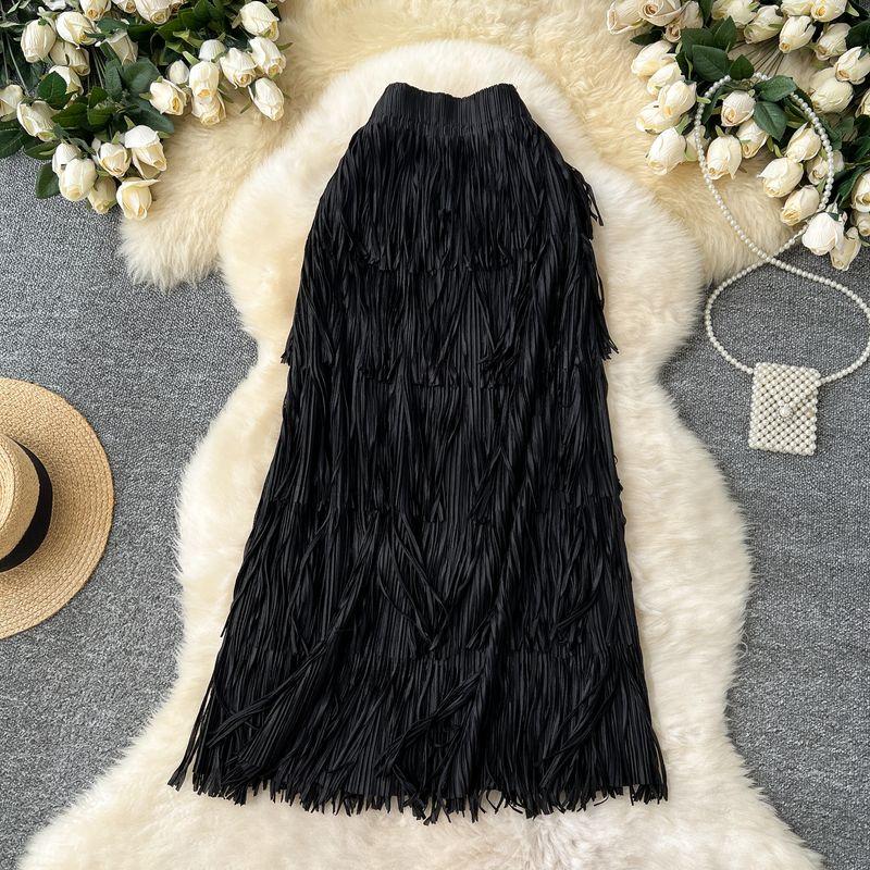 Юбка с бахромой для женщин 2024 Осень Эластичная талия Легче всего сочетать Приталенная А-силуэта Юбка средней длины Длинная длина Высокая талия Гофрированное платье-торт Black One size
