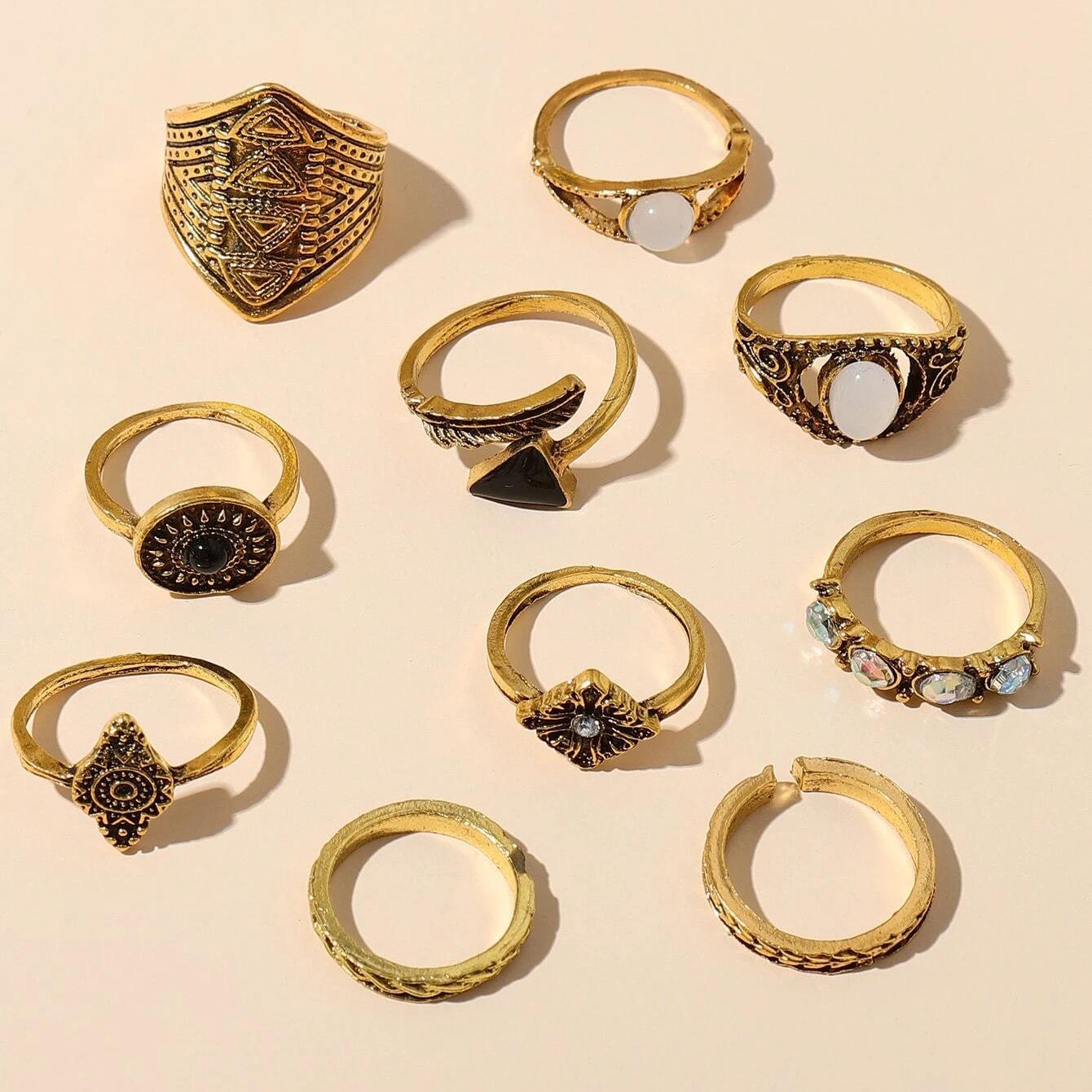 Ювелирное кольцо из 10 предметов, литературное и ретро-кольцо с нерегулярным геометрическим элементом для женщин one size золотой