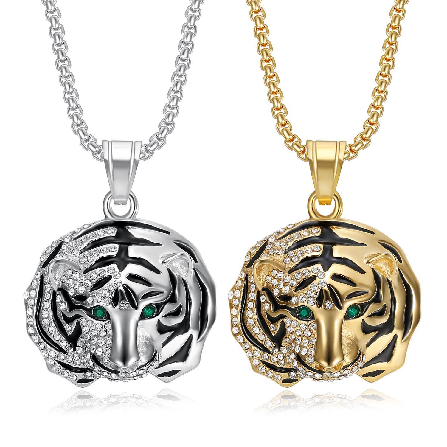 Ювелирные изделия из титановой стали, позолоченное ожерелье с подвеской в виде головы тигра с бриллиантами и красными и зелеными глазами