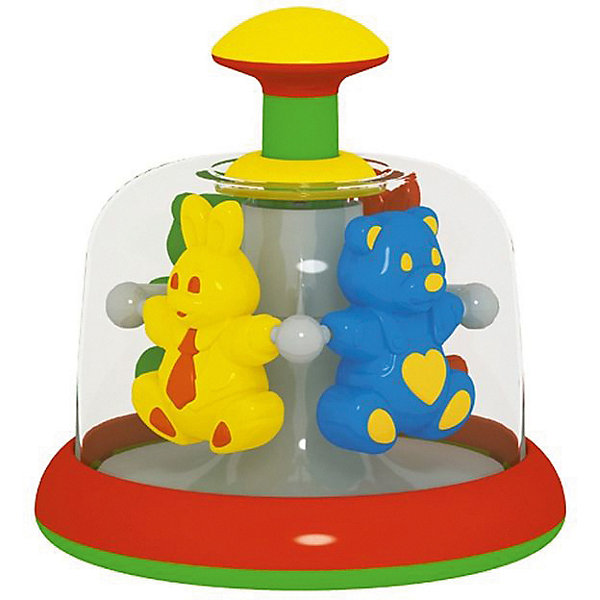 Юла устойчиво стоит на ровной поверхности, приходит в движение от нажатия кнопки сверху, поэтому справится даже малыш. Внутри находятся цветные фигурки животных, которые вращаются по кругу. Играя, ребенок изучает цвета, тренирует мелкую моторику, осознает причинно-следственные связи.