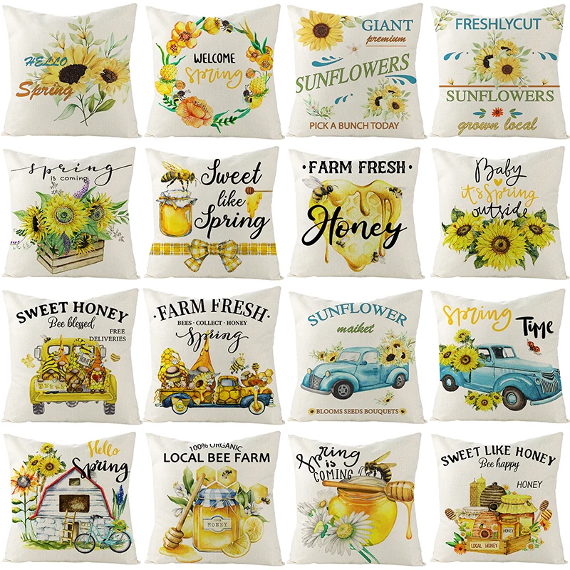 Spring Home Decor Linen Cushion Cover 45x45cm Bee Sunflower Printed Pillow Covers Farmhouse Home Decorative Throw Pillowcase