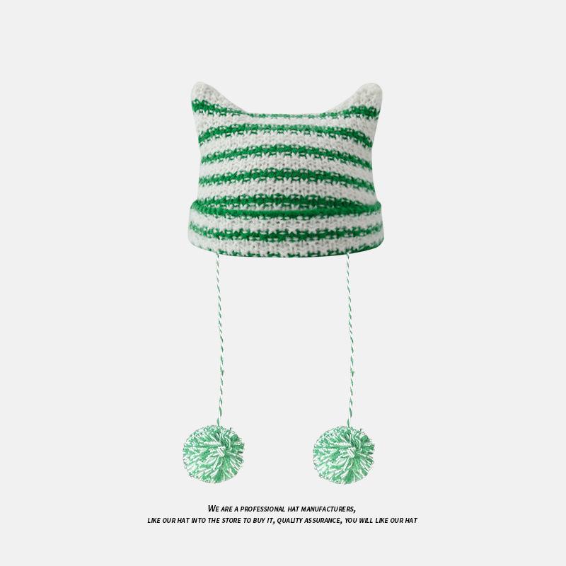 Японская милая шапка с меховым помпоном и дьявольскими рожками для женщин на осень и зиму, теплая и универсальная, нежная к лицу, вязаная шапка с маленькими полосками и кошачьими ушками one size