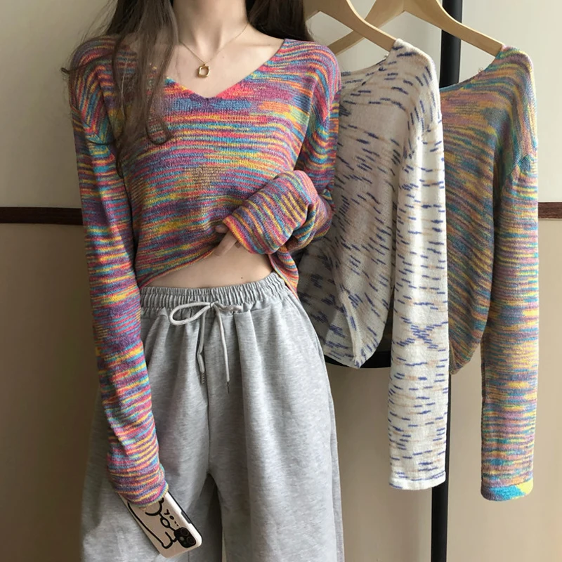 Укороченный свитер, Женский Повседневный вязаный пуловер с длинным рукавом, Радужный модный джемпер, тонкая Корейская Осенняя женская одеж...
