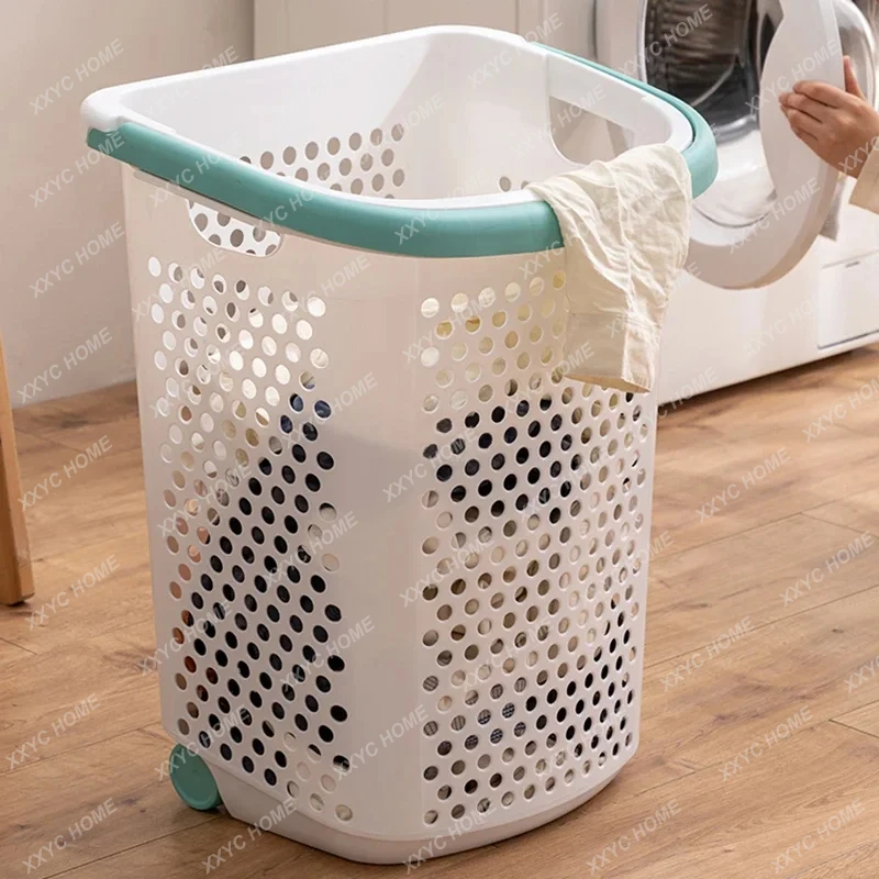 Японские Пластиковые большие корзины для белья, домашняя креативная корзина для грязной одежды с колесами, корзина для хранения в ванной комнате с ручками