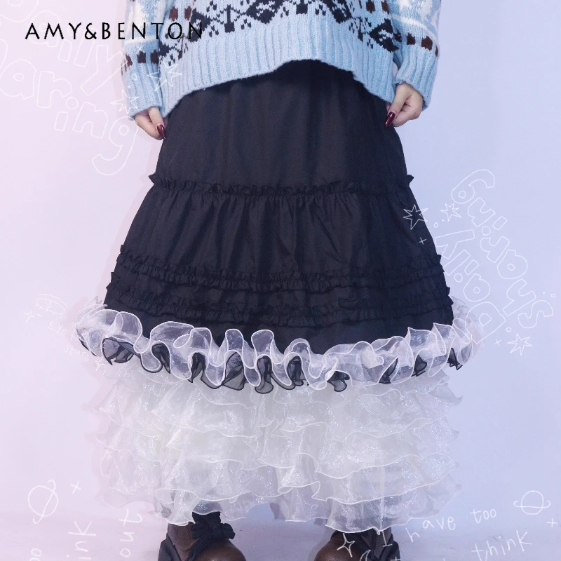 Японский дизайн, черная женская юбка с рюшами по подолу, осенняя новая милая крутая эластичная талия, однотонные длинные юбки трапециевидной формы для девочек