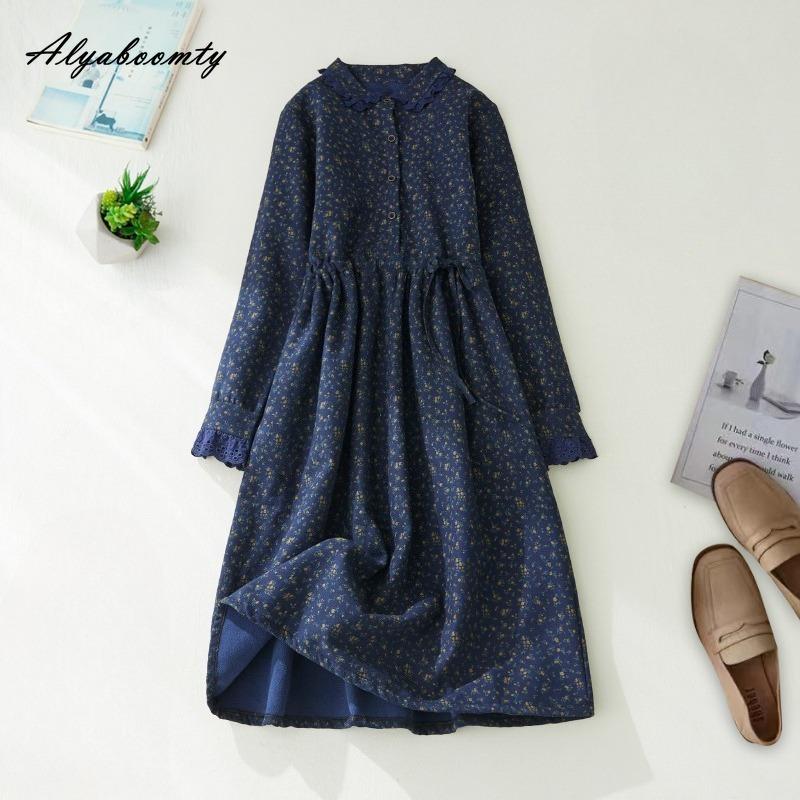 Японское платье миди Мори Гёрл Осень Зима Женское Платье с отложным воротником Красное Темно-синее с цветочным принтом Платье на шнуровке Флисовое Толстое Теплое Винтажное Платье XXL темно-синий