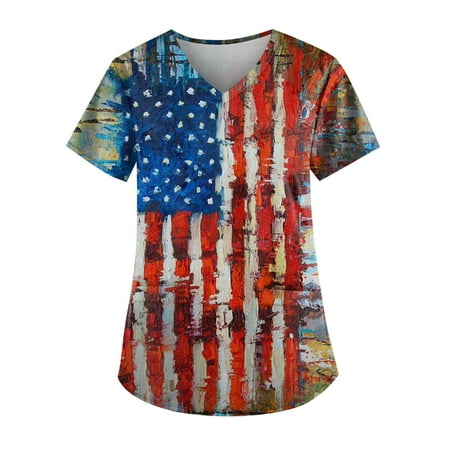 4th Of July American Flag Tops Scrubs For Women Tops Black Casual V Neck Short Sleeve Print Short Sleeve Work Clothes With Pocket Nurse Uniforms Women