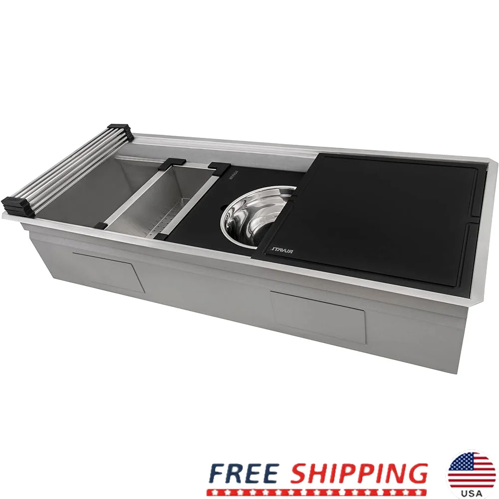 Dual-Tier Workstation Kitchen Sink Undermount 16 Gauge Stainless Steel with Brushed Finish Accessories Colander Cutting Board