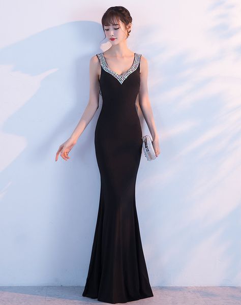 бисером v шеи атласная русалка вечернее платье 2018 черный длинные вечерние платья элегантные платья спинки, Black;red