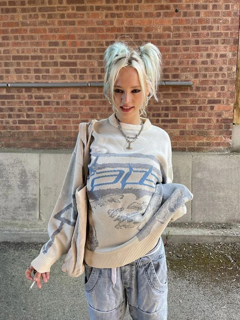 Женский свитер оверсайз, вязаный Топ с длинным рукавом Y2K, зимний винтажный волшебный пуловер в стиле гранж, уличная одежда в стиле Харадзюк...