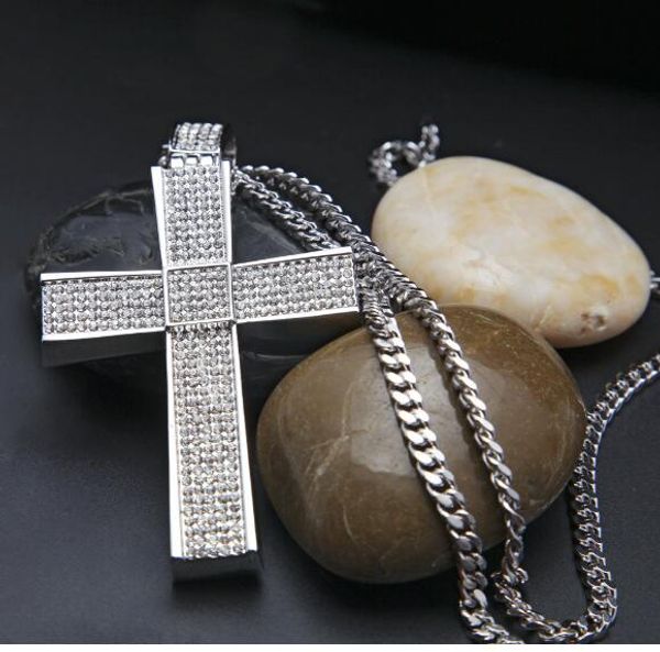 горячее серебро хип-хоп крест с полным стразами кулон ожерелье с цепочкой мужские ювелирные изделия ожерелье унисекс размер 9,5 см * 5 см ку, Silver