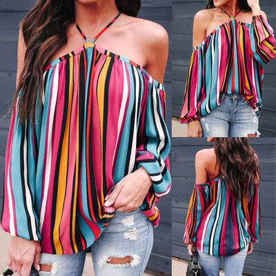 Nomeni Fashion Womens Slash Neck Long Sleeves Rainbow Printing T-shirt Blouse Tops