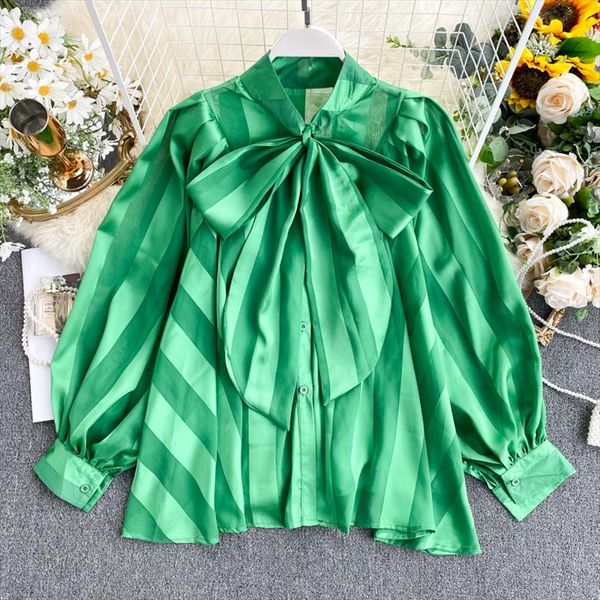 женская рубашка sprin осень новая атласная рубашка лук воротник слоеного рукав сыпучие управление леди top женщины блуза tide плюс размер то, White