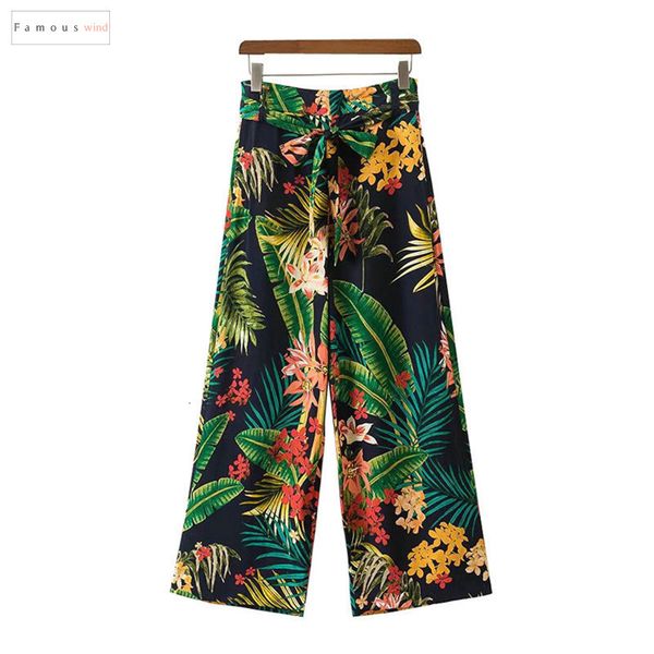 женщины брюки печать зеленый цветочной высокой талия пояс молния мода женская лето широкая ноги брюки уютные штаны xd62, Black;white