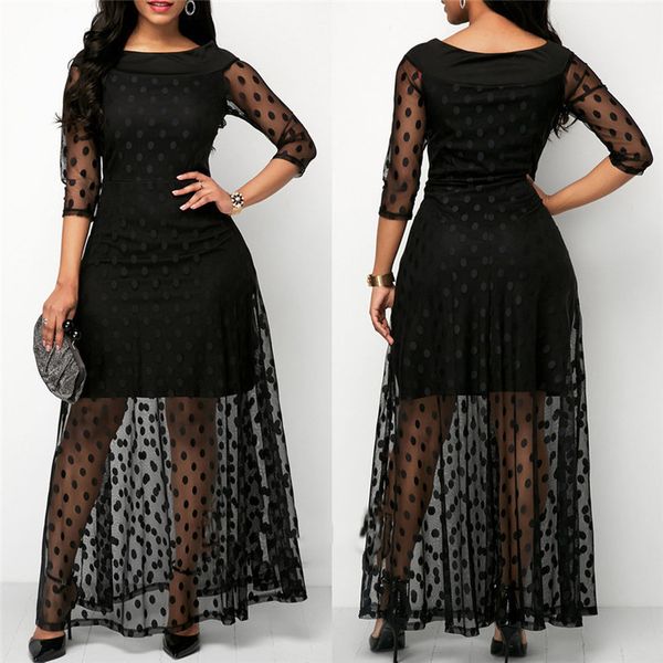 женщины голеностопного длина строчка горошек кружевном платье дамы лето mesh черный длинные платья макси сексуальные вскользь прямые макси п, Black;gray