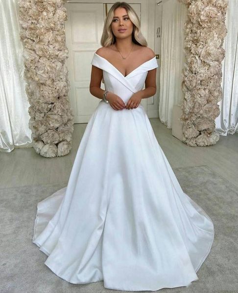 изготовленные на заказ атласные свадебные платья с открытыми плечами стреловидный шлейф с короткими рукавами богемная линия плюс размер свад, White