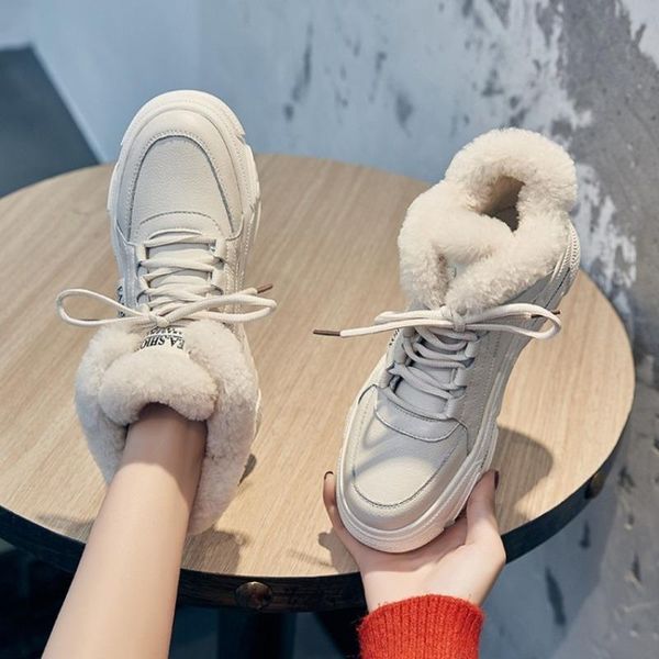 кожаная шерсть маленькая белая обувь снежные сапоги женщины 2021 мода зашнуровать досуг круглый носок женские туфли зимние теплые меховые бо, Black