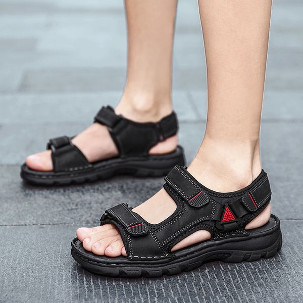 летние мужские сандалии натуральная кожа мягкая удобная мужская обувь новые модные тапочки повседневные пляжные сандалии большой размер 48, Black