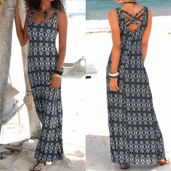 лето bohemian длинное платье женщины холтер шеи boho печать печать повседневный мини пляжная платье сарафане ropa mujer c, Black;gray