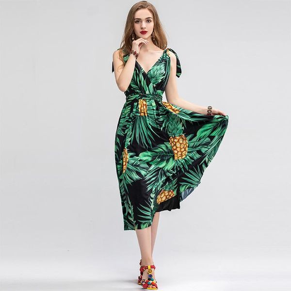 мода взлетно посадочной полосы летнее платье женская v образным вырезом ruched повседневная праздник богемный стиль цветочный ананас печати, Black