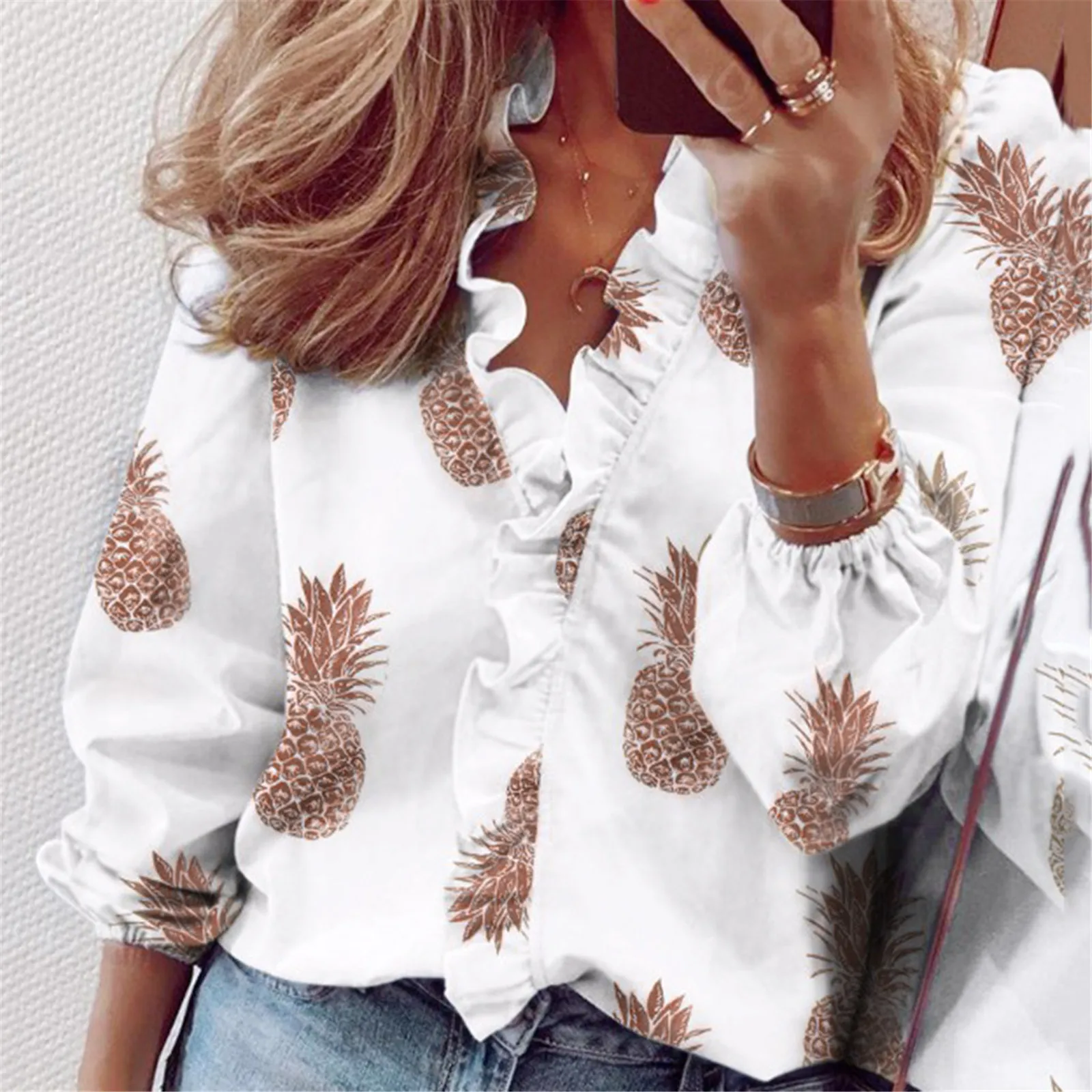 Fashion White Blouse Women Autumn V-neck Ruffle Long Sleeve Elegant Office Ladies Shirts Plus Size Casual Tops And Blouses Femme