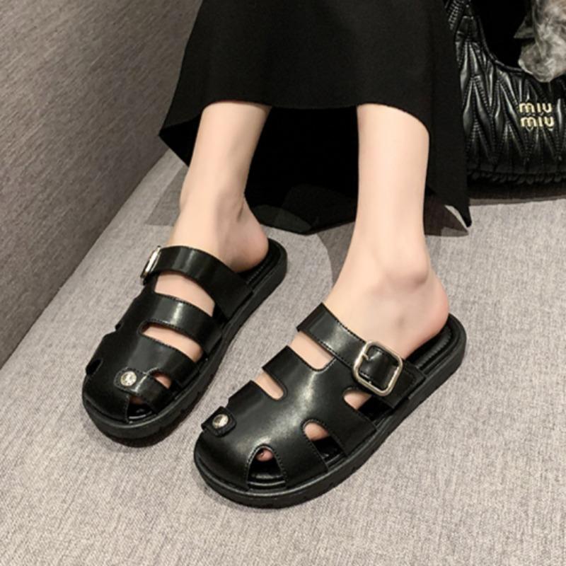 мода 2024 Новые мягкие повседневные сандалии Женские летние пляжные шлепанцы Нескользящие ремешки с пряжками Для дома и улицы Женские туфли на низком каблуке 42 чёрный