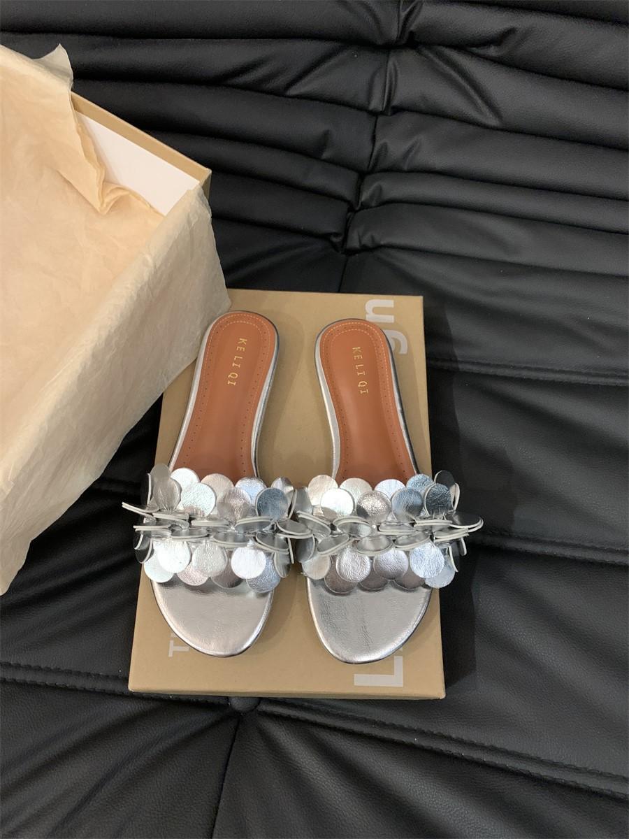 модные женские плоские тапочки плоские маленькие сандалии внешние туфли феи 2024 новые летние шлепанцы серебряные сандалии женская обувь 39 серебряный