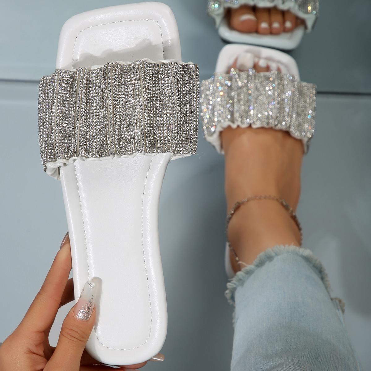 модные летние сандалии женские шлепанцы со стразами плоские сандалии женские черные тапочки женские с круглым носком блестящие роскошные сандалии Mujer 43 43 белый