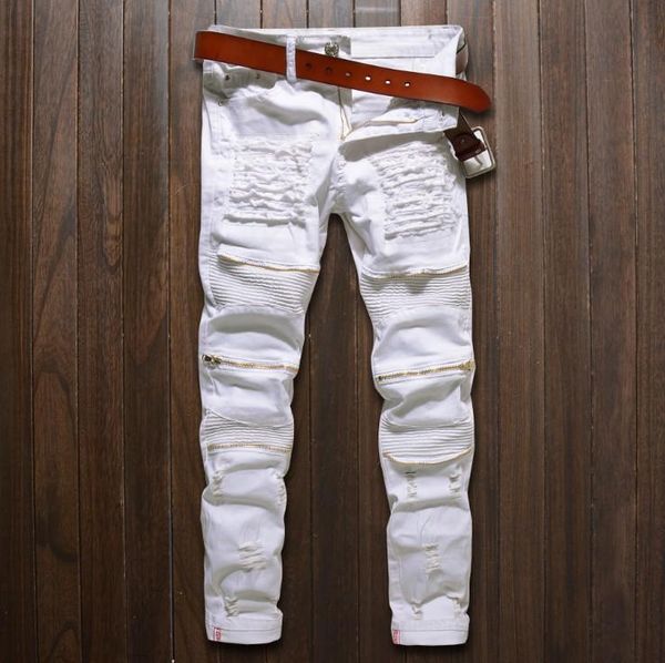 мужская рваная тощая проблемная разрушенная прямая посадка молния мотор джинсы с отверстиями мужская молния джинсы модный дизайн, Blue