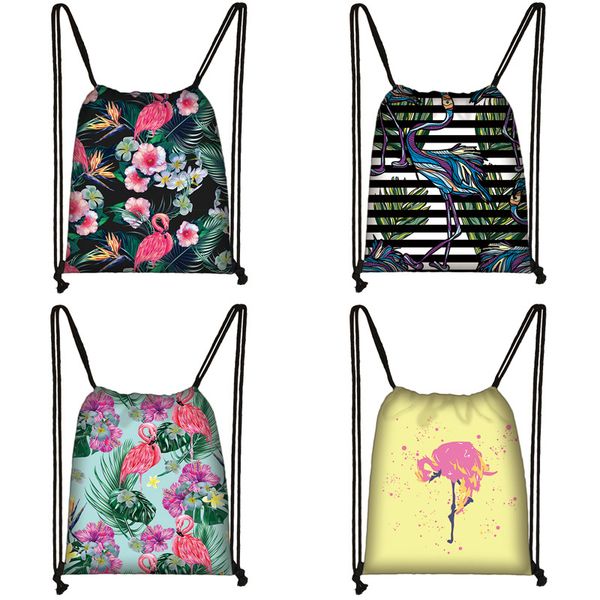 мультфильм фламинго печати drawstring сумка женщины дорожная сумка подросток школа коричневый девушка и мальчик рюкзак мода сумки для хранен