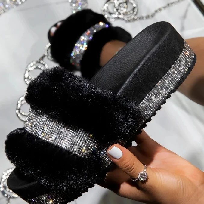 2021 Winter Warm Women Fluffy Faux Fur Slipper Slides Fashion Shiny Rhinestone Flat Sandal Shoes