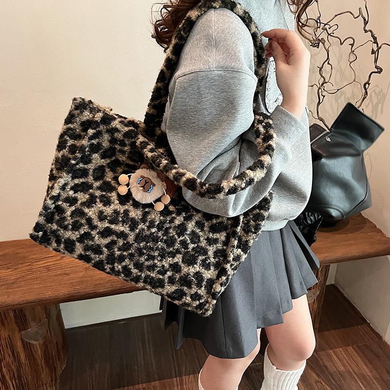 осень-зима 2025 новая вместительная сумка-тоут с леопардовым принтом, плюшевая сумка для студентов колледжа, сумка для поездок на работу из овечьей шерсти, универсальная сумка-тоут small 30 * 6 * 27 чёрный