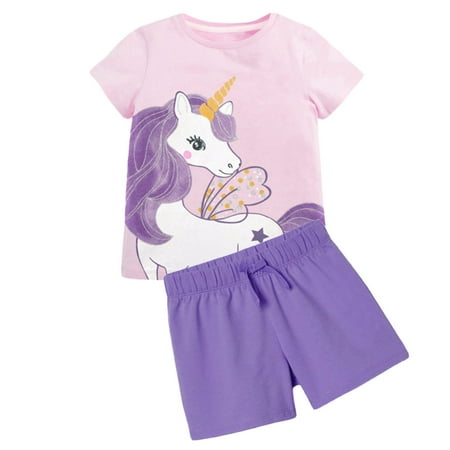 2-7T Baby Girls Short Sleeve Tshirt Tops Drawstring Shorts 2PCS Summer Cartoon Outfits Purple Unicorn