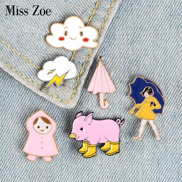 walking in the rain enamel pins clouds girl umbrella rainboots badge custom brooch bag clothes lapel pin funny animal jewelry