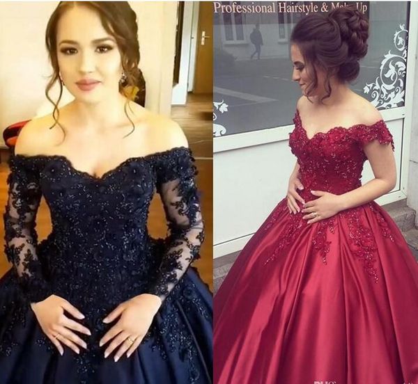 с плеча темно-синий quinceanera платья с длинными рукавами бальное платье темно-красный платья выпускного вечера атласный корсет обратно фио, Blue;red
