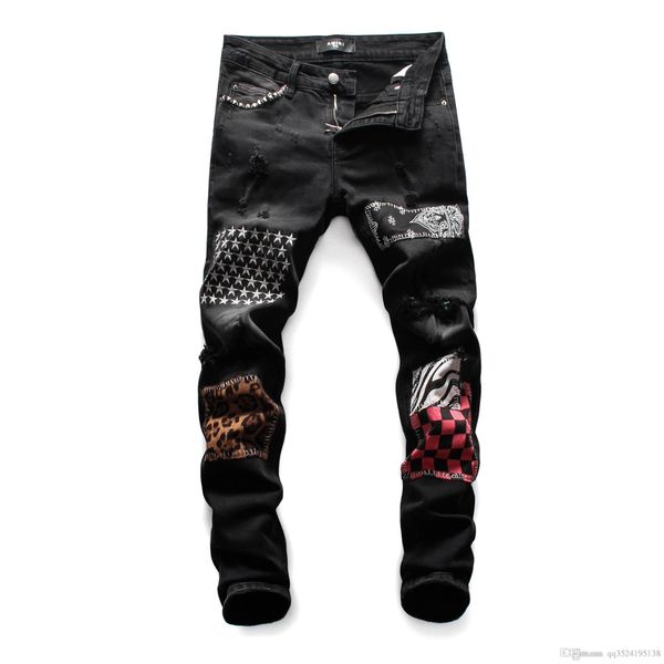 уникальная мужская одежда отверстие патч мыть плиссированные печати черные джинсы молодежь тонкий мода маленькая нога локомотив брюки, Blue