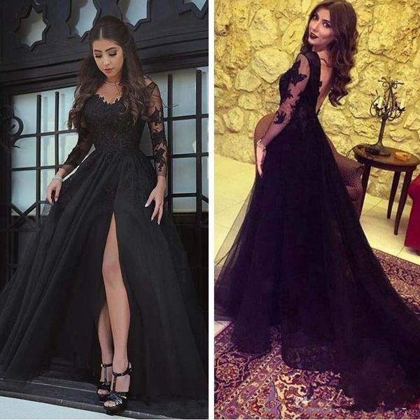 черный длинные платья выпускного вечера v шеи sheer длинные рукава backless вечернее платье кружева аппликации side split плюс размер формал, Red