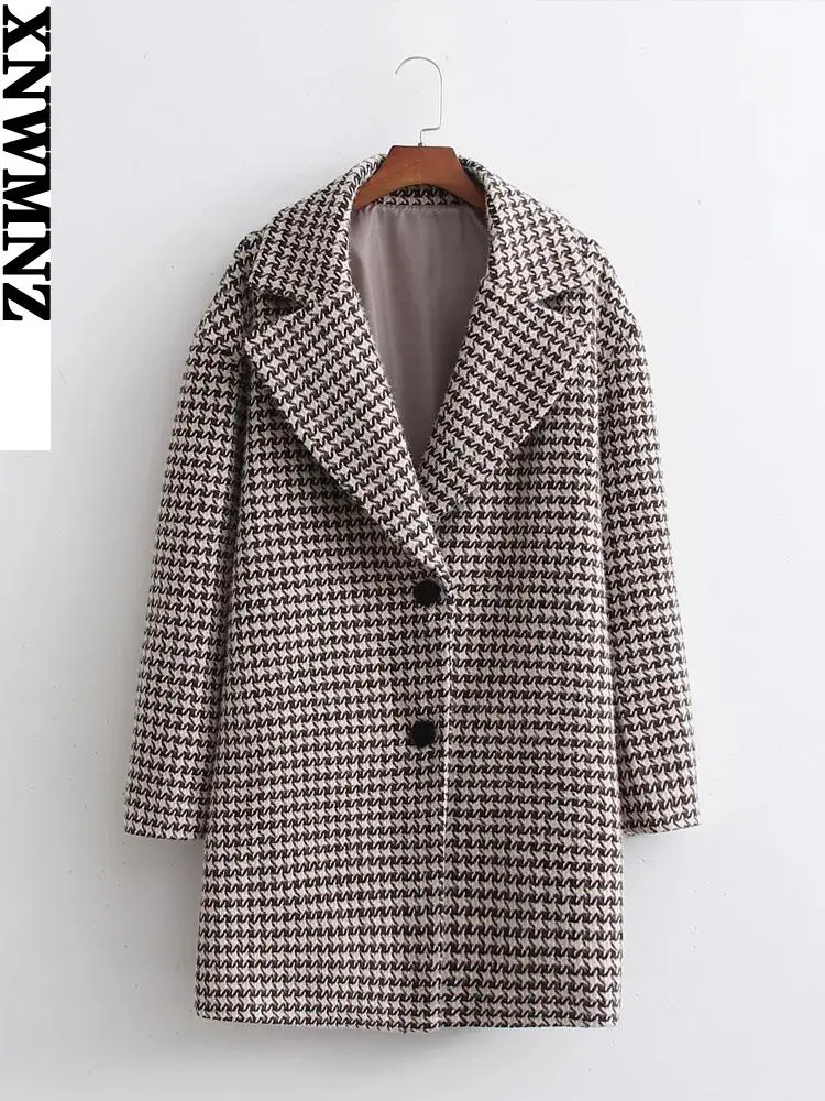 XNWMNZ Женское шерстяное пальто с рисунком «гусиные лапки», Женская винтажная длинная куртка с отложным воротником и длинным рукавом, Осень-зи...