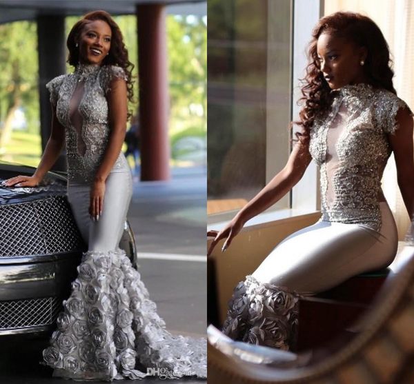 южная африка вечерние платья высокая шея с капюшоном рукава 2018 русалка пром платье длинная роза поезд погружаясь sheer бисер блестки кокте, Black