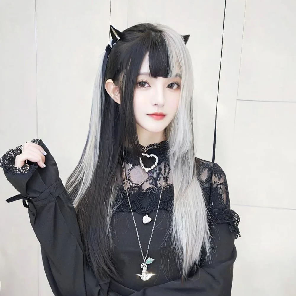 Парик с раздельным красителем — черные и серые готические волосы, прямая полная шапочка с челкой, темная альтернативная мода, аксессуары для косплея