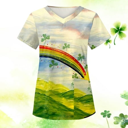 Funicet Savings Clearance 2023! Plus Size Tops St Patricks Day Shirt for Women Scrubs Top Women s Working Uniform Nursing Uniform With Two Pockets Short Sleeve V-neck Summer Blouse