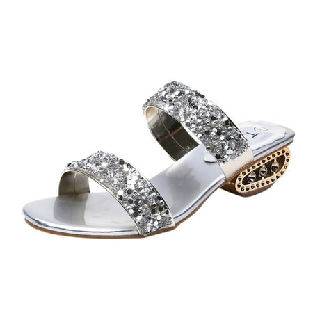 sandals for Women Fashion Summer Women Sandals Thick Heel Low Heel Double Strap Shiny Sequins Sexy PU Dress Sandals for Women Silver