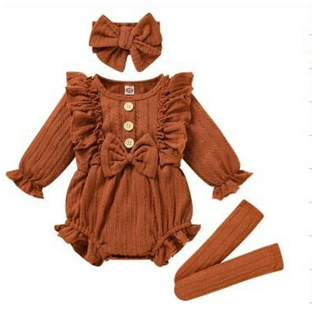 Newborn Baby Girls Clothes Sets Solid Knitted Button Bowknot Bodysuits+Headband+Socks Warm Outfits Infant Autumn Winter Clothing (Beige 0-3 Months)